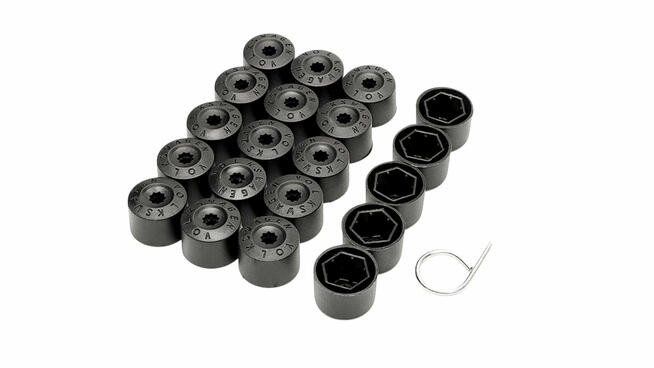 NAKŁADKI KAPSLE ZAŚLEPKI NA ŚRUBY FELG DO VW 17 mm KOMPLET 20 szt + ŚCIĄGACZ KOLOR CZARNY WYSOKOŚĆ 22 ...